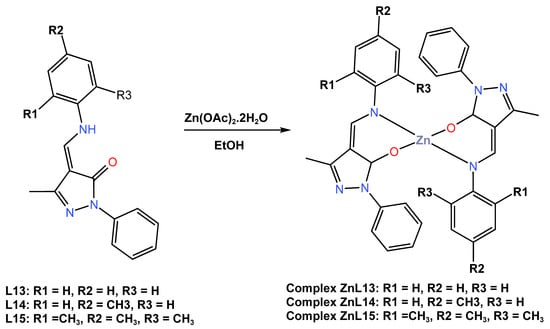 Molecular structure of ligands L13–L15 and their corresponding Zn (II) complexes ZnL13–ZnL15 reported by Gusev et al. (2021) [45].