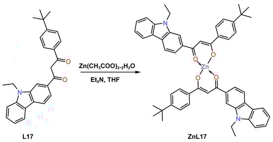 Also in 2021, Liu and colleagues [47] reported efficient deep blue-emitting material electroluminescent devices based on a new β-diketone Zn (II) complex ZnL17 for application in OLEDs. The complex was prepared as a yellow powder in 70% yield from the reaction of 1-(4-(tert-butyl)phenyl)-3-(9-ethyl-9H-carbazol-3-yl)propan-1,3-dione L17 with zinc acetate dihydrate (THF) using redistilled triethylamine (Et3N) in tetrahydrofuran solvent (Scheme 7). The mechanism of luminescence was also explored by DFT and time-dependent DFT calculations, which revealed the zinc complex had a fluorescence emission mechanism of ZnL17 that switched from LUMO to HOMO, with the former being mainly on the phenyl group and the latter being mainly on the carbazole moiety. The calculated energy-level gap of HOMO and LUMO was reported to be 3.29 eV, while the optical gap was 2.95 eV. It was also established that the complex was thermally stable up to 327 °C, as determined by the TGA studies. The UV–Vis absorption of ZnL17 in dichloromethane has been reported in the range 200–400 nm, with absorption peaks at 240, 285, 331, and 384 nm devising from π-π* transitions, while the long-wave absorptions at 331 and 384 nm were assigned to a large conjugated system of carbazolyl units (see Table 1). The photoluminescent property of the complex was observed to have emission band at 453 nm with 5.5% in dichloromethane solution. The author described the manufacture of three devices with an ITO|HAT-CN|NPB|MADN:ZnL17|TPBi(40 nm)/LiF(1 nm)|Al configuration utilizing three distinct guest-doping concentrations of 1 weight (wt)%, 3 wt%, and 5 wt% of ZnL17 complex. The 3% doping device demonstrated deep-blue electroluminescence and attained the greatest electroluminescent performances among them. At maximum voltage of 8 V, this deep-blue device produced a CIE value of (0.1558, 0.0901), which is quite near to the NTSC standard blue value (0.14, 0.08) (see Table 2). The 3 wt% doping device achieved the best electroluminescent performances with maximum current efficiency of 1.63 cd/A, external quantum efficiency of 1.54%, power efficiency of 1.5 lm/W, and maximum brightness of 2096 cd/m2. Despite the fact that the 3 wt% device had a deep-blue emission and a CIE Y coordinate value similar to the NTSC standard blue value, improving its structure is required due to the use of maximum voltage to achieve maximum brightness.