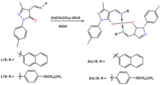 Molecular structure of ligands (L18 and L19) and their corresponding Zn (II) complexes ZnL18 and ZnL19 reported by Solanki (2022) [48].