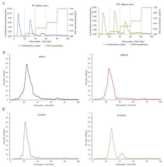 The extraction ratios of crude P0 and P15 polysaccharides were 23.19% and 25.45%, respectively. After six deproteinization treatments, the protein removal rate of P0OP and P15OP was 84.52% and 83.97%, respectively, and the polysaccharide retention rate was 70.63% and 68.29%, respectively. The pigment removal rate of P0OP and P15OP was 68.74% and 67.69%, respectively, and their polysaccharide retention rate was 86.05% and 84.3%, respectively. After dialysis, the P15OP solution was slightly yellow, whereas the P0OP solution was nearly colorless. Elution curves of the P0OP and P15OP solutions were obtained using DEAE-52 anion-exchange column chromatography (Figure 1A). P0OP yielded two single components, P0OP-1 and P0OP-2, whereas P15OP yielded three single components, P15OP-1, P15OP-2, and P15OP-3. The elution curves of P0OP-1, P0OP-2, P15OP-1, and P15OP-2 with higher contents were obtained by Sephadex G-100 gel column chromatography (Figure 1B,C), and single components were obtained, denoted as P0OP-I, P0OP-II, P15OP-I, and P15OP-II.