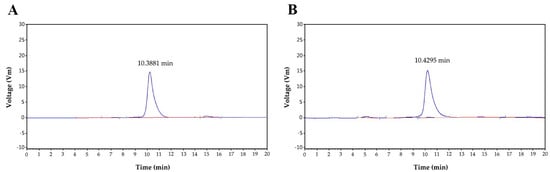 The retention time of P0OP-I at 10.3881 min (A) and P15OP-I at 10.4295 min (B), as determined by HPGCP spectrometry.