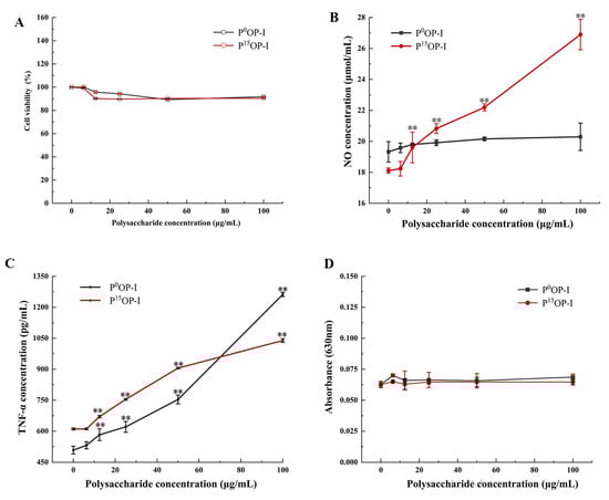Effect of polysaccharides P0OP-I and P15OP-I on cell viability and immunocompetence of RAW264.7. (A) Cell viability detected by MTT. (B) NO release detected by chemical analysis. (C) TNF-α production determined using the ELISA method. (D) ROS production determined using the nitroblue tetrazolium (NBT) assay. The data are expressed as mean ± SD; ** p < 0.01 denote statistically significant difference between the treated group (6.25–100 μg/mL of P0OP-I or P15OP-I) and the control group (0 µg/mL of P0OP-I or P15OP-I).