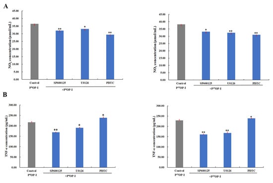 (A) The generation of NO induced by P0OP-I or P15OP-I (gray bars) was lowered by JNK1/2 MAPK inhibitor SP600125, Erk1/2 MAPK inhibitor U0126 and NF-κB activation inhibitor PDTC (blue bars) in RAW264.7 cells. (B) The generation of TNF-α induced by P0OP-I or P15OP-I (gray bars) was lowered by SP600125 and U0126 while enhanced by PDTC (blue bars). The data are expressed as mean ± SD; * p < 0.05 and ** p < 0.01 denote statistically significant difference between the control group (P0OP-I or P15OP-I) and the treated group (P0OP-I + inhibitor or P15OP-I + inhibitor).