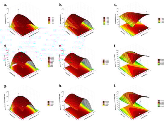 The three-dimensional plots showing the effects of ethanol/water % (v/v) (X1) with amplitude (%) (X2) (Figure 2a,d,g), ethanol/water % (v/v) (X1) with time (min) (X3) (Figure 2b,e,h), and amplitude (%) (X2) with time (min) (X3) (Figure 2c,f,i) on the rosmarinic acid, the sum of phenolic acids, and the sum of phenolic compounds content are presented in Figure 2.
