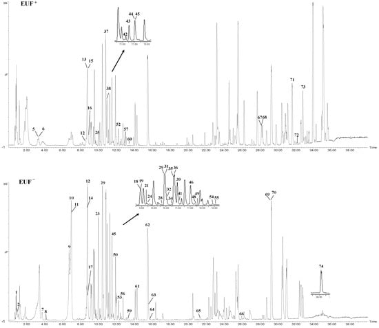 In this research, the chemical components in different parts of EU were investigated using UPLC-QTOF-MS/MS, and peak identification was performed. A total of 74 compounds (as shown in Figure 1 and Figure S1 and Table 1), including 21 lignins, 17 iridoids, 17 phenylpropanoids, 13 flavonoids, and 6 other components, were identified or tentatively assigned using UNIFY 1.7 software (Waters Corporation, Milford, CT, USA) by the matching of empirical molecular formulae, quasi-molecular ions, and fragment ions or comparing their characteristic high-resolution mass data with the data from previous publications [33,34,35,36]. The mass error for the molecular ions of all identified compounds was within ± 10 ppm and based peak ion (BPI) diagrams in the negative and positive ion modes are displayed (Figure 1 and Figure S1). The distribution of the compounds was as follows: 62 compounds in male flowers; 49 compounds in pollen; 48 compounds in bark; and 60 compounds in leaves. EUP had 3 lignans, 14 phenylpropanoids, 13 cyclic ether terpenes, 13 flavonoids, and 6 other compounds.