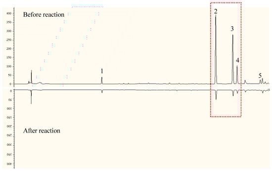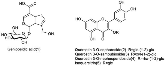 The chromatogram of the 50% methanol extraction of EUP spiking with DPPH at 254 nm showed that five compounds, 1–5, in the 50% methanol extraction of EUP possessed antioxidant activity (see Table 2, Figure 2 and Figure 3). Compounds 2–4 had larger UV absorption at 254 nm before the DPPH reaction, which significantly decreased or even disappeared after the reaction, indicating that these three compounds showed higher antioxidant capacities compared to other components. The ESI-MS results indicate that compounds 2–5 had phenolic hydroxyl structures, which were considered to be the main reason for their DPPH radical-scavenging ability.