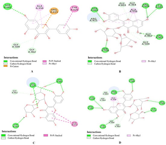 The interaction energy states a total for all of the types of interactions, such as the van der Waals force, hydrogen bonding, the charge effect, hydrophobic interactions, etc. Figure 5 exhibits the 2D interaction diagrams for the separated compounds. As displayed, all three compounds had higher binding affinity values than quercetin. QSH exhibited the highest interaction energy of 71.67 kcal/mol with the carbon–hydrogen bonds of Ser602, Val604, Leu365, Val463, Ser503, Arg415, Gly462, Gly509, Gly603, and Gly364, followed by QNH, which showed an interaction energy of 61.62 kcal/mol with the carbon–hydrogen bonds of Arg380, Arg415, Gly603, Gly364, Val604, Leu365, Val463, and Gly509, while QSB showed the lowest interaction energy of 54.67 kcal/mol with the carbon–hydrogen bonds of Arg415, Arg483, Gly462, and Ser363. The interaction energy of quercetin is only 34.0138.