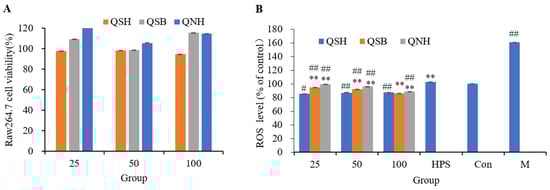 Cell experiment results. (A) Effects of different concentrations of QSH, QSB, and QNH on the activity of Raw264.7 cells, (B) Effects of different concentrations of QSH, QSB, and QNH on ROS production in Raw264.7 cells. DCF fluorescence was quantified in control (Con) and Raw264.7 cells incubated in the absence (M) or in the presence of QSH, QSB, or QNH for 24 h. Data are expressed as a percentage of control. Values are the mean ± SD from three independent experiments. (HPS) quercetin, (M) Model. Significant differences are denoted by symbols: ## p < 0.01, # p < 0.05 vs. control; ** p < 0.01 vs. M.