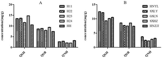 Four varieties and mixed pollen were tested, and it was found that the contents of the three quality markers in the EUP of different varieties were within the normal ranges (Figure 7A). In addition, pollen from different producing areas was compared, and there were no significant differences in the contents of quality markers in pollen from five places (see Figure 7B).