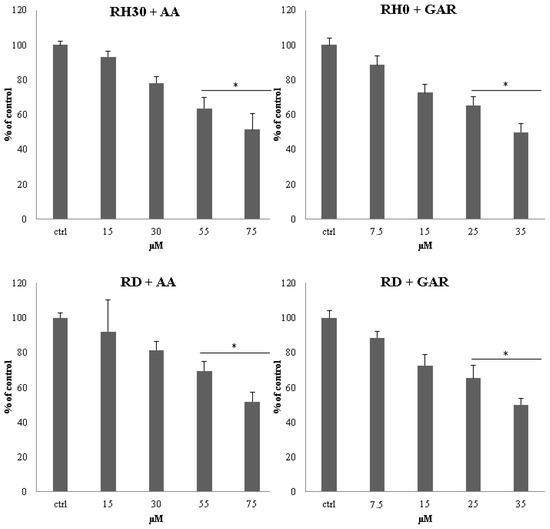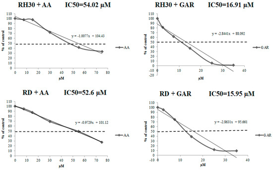 Evaluation of the viability of RH30 cells cultured in the presence of AA (7.5, 15, 30, 55, 75 µM) and GAR (2.5, 7.5, 15, 25, 35 µM). The viability index was calculated using the following formula: (cell viability (% of control) = [(A tested-A blank/A control-A blank)] × 100%). The IC50 value was calculated from the trend line equation. A representative result from three independent experiments is shown.