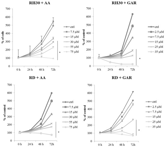 To evaluate the effect of GAR and AA on RMS viability, we applied WST-1 over a broad range of tested compound concentrations. RH30 and RD cells were cultured in a medium with AA (7.5, 15, 30, 55, 75 µM) or GAR (2.5, 7.5, 15, 25, 35 µM). In both cases, a similar tendency was observed, namely, the percentage of viable alveolar (ARMS) and embryonal (ERMS) cells decreased with increasing concentrations of AA and GAR (Figure 1). We calculated the IC50 index: for AA and RH30 cells, the IC50 was 54.02 µM, and for RD cells, the IC50 was 52.6 µM, while for GAR, it was 16.91 µM and 15.95 µM, respectively. Then, the effect of AA and GAR on the proliferation of RH30 and RD cells was assessed (Figure 2), and a decrease in the growth kinetics of the examined cells was noted in just 24 h after the addition of the compounds. The decrease in the proliferation rate of RH30 and RD cells was proportional to the increase in the HAT inhibitors (HATi) dose. Statistically significant differences in the proliferation rate of the tested cells in relation to the control cells were observed at doses of 30, 55 and 75 µM for AA and 15, 25 and 35 µM for GAR.
