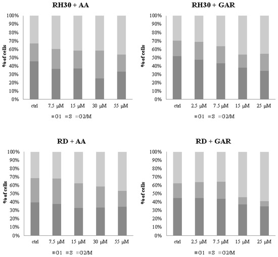 The decrease in the multiplication rate of RMS cells and the reduction in colony numbers under the influence of AA and GAR may be related to their effect on the cell cycle (Figure 4). In the case of RH30 cells incubated with AA, statistically significant differences in the cell cycle shift were observed at a concentration of 55 µM, where the percentage of cells in the G2/M phase increased to 46.35% (the percentage of control cells oscillated around 33%) (Figure 4). This change was accompanied by a decrease in the number of cells that were in the G1 phase (from 45.24% for control to 33.31% for 55 µM AA). Slight fluctuations were observed in the S phase. The same trend was observed in the RD cell line, where the highest concentration of AA caused the cells to arrest in the G2/M phase of the cell cycle (31% control, 43% 55 µM AA) (Figure 4 and S2). The G1 phase did not change significantly, while the S phase was reduced from 29.18% for the control to 17.27% for 55 µM AA. GAR had a stronger effect on the cell cycle (Figure 4). In the RH30 line, a significant reduction in the number of cells in the G1 phase was observed at concentrations of 15 and 25 µM (control 51.63%, 15 µM GAR 34.17%, 25 µM GAR 34.12%). In addition, an increase in the percentage of cells remaining in the G2/M phase was observed (control 29.69%, 15 µM GAR 41.96%, 25 µM GAR 45.37%). In the RD cell line, there was a decrease in the number of cells in the S phase (control 17.56%, 15 µM GAR 8.68%, 25 µM GAR 6.12%) and an increase in the number of cells in the G2/M phase (control 37.49%, 15 µM GAR 54.42%, 25 µM GAR 59.04%). The above changes reached statistical significance. In addition, slight fluctuations were observed in the G1 phase for the RD line and the S phase for the RH30 line (Figure 4).