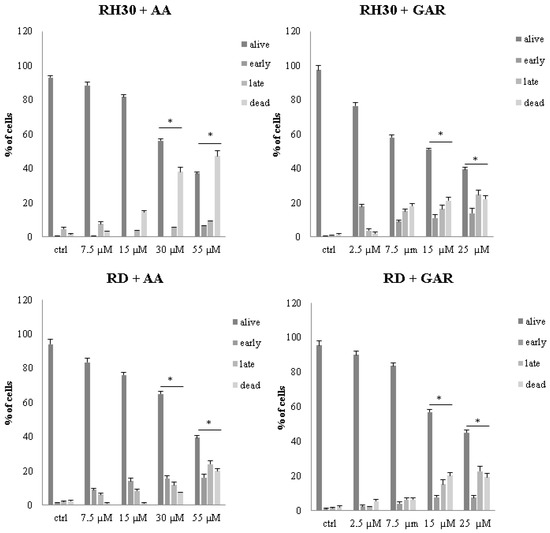 Assessment of apoptosis of RH30 and RD cells in the concentration gradient of AA (7.5, 15, 30, 55 µM) and GAR (2.5, 7.5, 15, 25 µM). The result from 3 independent experiments is presented. (*) = p < 0.05, as compared to the number of control (untreated) cells.
