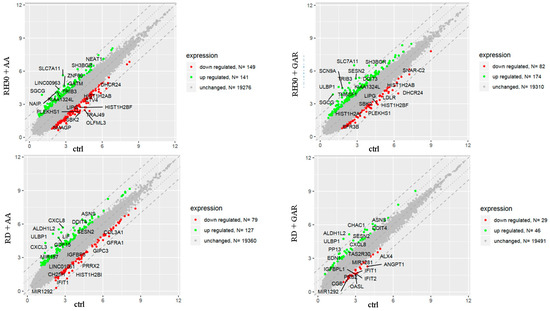 Graphical representation of the analysis of expression of altered genes in RH30 and RD cells incubated with AA and GAR compared to control cells. Each gene is marked with a dot. Genes marked in green increased their expression at least 2-fold, while genes with at least a 2-fold decrease in expression compared to controls are represented by red dots.