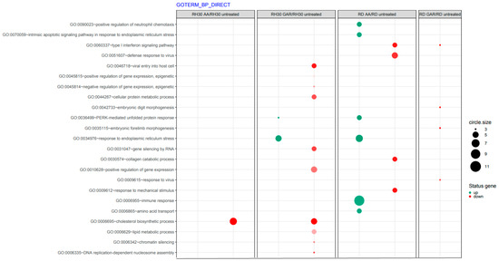 Inventory of biological processes affected by garcinol (GAR) and anacardic acid (AA) in ARMS and ERMS cell lines based on gene ontology (GO). The size of each dot represents the number of genes involved; fold difference >2 or <−2; p < 0.05, FDR-adjusted p-value was less than 0.2.