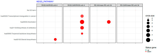 List of functions of biological processes altered by GAR and AA in RMS cells, obtained from the KEGG collection. The size of the circle is directly proportional to the number of genes involved in the process. The size of each dot represents the number of genes involved; fold difference >2 or <−2; p < 0.05, FDR-adjusted p-value was less than 0.2.