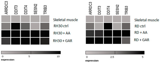 Heat maps of RQ-PCR results showing expression of ER-stress-related genes selected by microarray analysis in RMS cells treated with AA and GAR. The figure shows the activity of ARRDC3, DDIT4, SESN2 and TRIB3 genes in striated muscle, RH30 cell line and RH30 cells cultured in the presence of AA (55 µM) or GAR (15 µM).