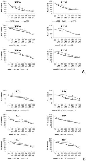 Concomitant treatment of RMS cells with chemotherapeutics (actinomycin D (ACTD), cyclophosphamide (CP), vincristine (VCR) and subtoxic concentration of AA (55 µM) or GAR (15 µM). Panel (A) shows the proliferative potential of RH30 cells after co-treatment with selected doses of chemotherapeutic agents and AA or GAR. Panel (B) presents the effect of simultaneous stimulation of RD cells with selected doses of chemotherapeutics and AA or GAR on their proliferation rate. (ACTD—actinomycin D, CP—cyclophosphamide, VCR—vincristine). All experiments were repeated three times with similar results. (*) = p < 0.05 compared to cells subjected to the chemotherapeutic treatment only.
