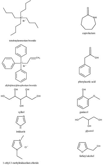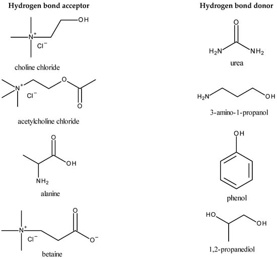 An alternative to ILs is using deep eutectic solvents (DESs), which were originally introduced as systems formed from a mixture of two or more Lewis acids and bases or Brønsted–Lowry acids and bases, and which have a lower freezing point compared to the starting constituents. In recent years, the definition of a DES was made more precise and it has been established that the term “deep eutectic solvent” can only be assigned to a eutectic mixture for which the eutectic point temperature is lower than that calculated from the Schröder–Van Laar equation valid for an ideal liquid eutectic mixture [1]. However, in practice, most researchers use the term “deep eutectic solvent” simply for the eutectic mixture. DESs are usually obtained by mixing several reagents to form a homogenous liquid. There is always a small amount of water in these solvents, which is involved in the formation of a network of hydrogen bonds. Deep eutectic solvents have similar physical properties to ionic liquids, and they are practically non-volatile and non-flammable, but additionally they are definitely cheaper and usually easier to synthesize, and they are less toxic and often biodegradable. However, compared to ILs, DESs have lower thermal stability and a lower electrochemical window [2]. The vapor pressure of eutectic liquids is higher than that of ionic liquids, but still relatively low. For an N,N-diethylethanolammonium chloride 1: 2 mixture with glycerol at temperatures from 343 to 393 K, the vapor pressure is from 2 to 60 Pa, and for mixtures with urea it is from 0.14 to 6.8 Pa [3]. Similar to ionic liquids, eutectic liquids’ physical properties can be controlled by changing the composition and ratio of their components in order to obtain properties favorable for a specific application. These properties are affected by the chemical structure of the DESs and the resulting interactions between their components, mainly the hydrogen bonds that are responsible for the physical state of deep eutectic solvents. Examples of commonly used ingredients of DESs, i.e., hydrogen bond acceptors (HBAs) and hydrogen bond donors (HBDs), are presented in Figure 1.