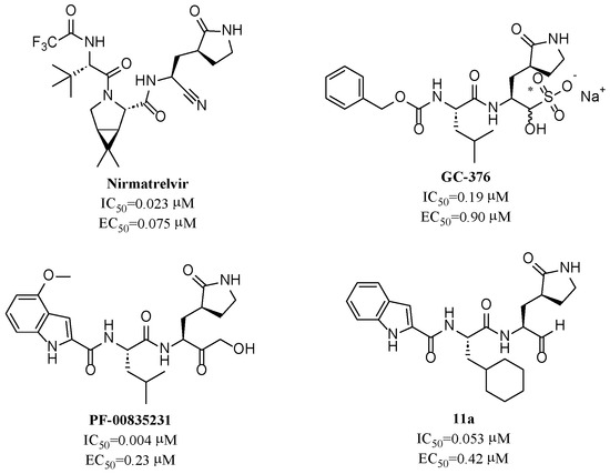 To date, several ligands targeting Mpro have been reported (Figure 3) [19,20,21]. Nirmatrelvir, developed by Pfizer, acts as an orally active ligand in combination with the CYP3A inhibitor Ritonavir [4,22]. GC-376 [23], PF-00835231 [24,25], and 11a [26] are currently under clinical trials. All of these peptidic inhibitors simulate the endogenous substrate of Mpro and possess warheads which could covalently bind with the vital catalytic residue Cys145.