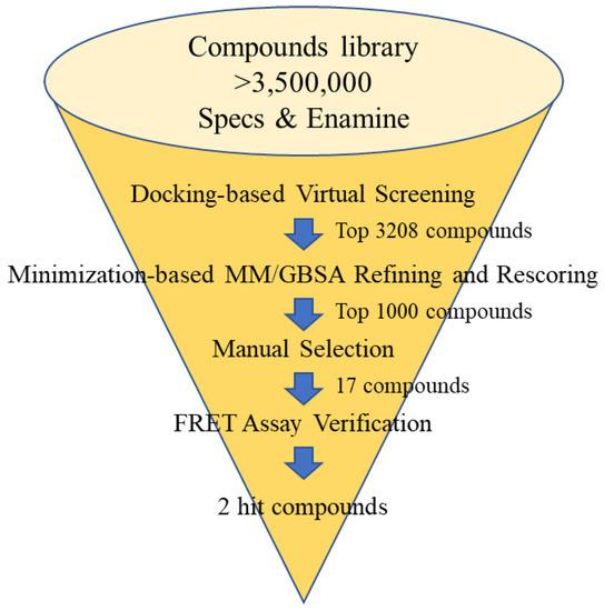 The flow chart of the discovery of inhibitors against SARS-CoV-2 Mpro via docking-based virtual screening.