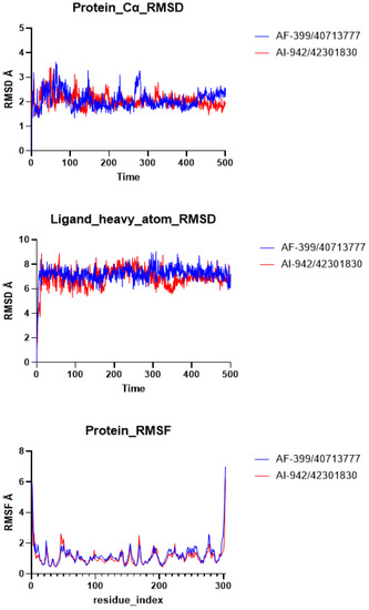 MD simulation is a powerful computational technique that can provide insights into the structure, dynamics, and interactions of biomolecules at the atomic level. The initial biological results suggest that AF-399/40713777 and AI-942/42301830 possess moderate inhibitory activity toward SARS-CoV-2 Mpro. The binding conformations of these two ligands with the pocket were then investigated. The MD simulation results show that both AF-399/40713777 and AI-942/42301830 bind to the catalytic site of Mpro. The RMSD plots of the ligands heavy atoms and protein backbones were generated (Figure 6). The RMSF values of the ligands were also estimated (Figure 6). The computer data indicate that both of AF-399/40713777 and AI-942/42301830 have stable binding conformation with Mpro, as shown through the 500 ns MD simulation.