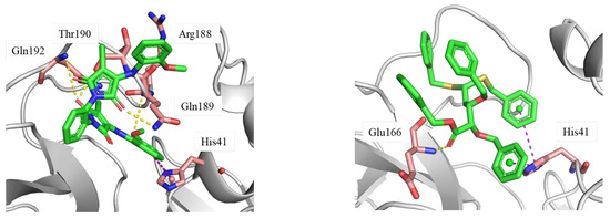 Crystal structure of Mpro homodimer and the catalytic site. Ligand: green stick/sphere; key residues: pink stick; hydrogen bond: yellow dashed line; π-π stacking: purple dashed line; PDB code: 7KX5 [18].