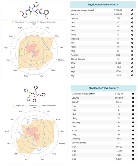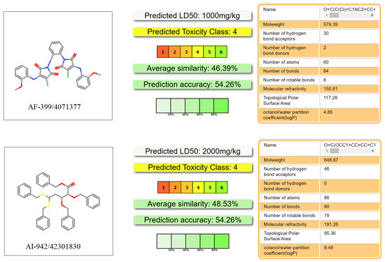 ADMET is an important aspect of drug discovery and development as it determines the efficacy, safety, and optimal dosage of a drug. A poor ADMET profile is one of the main reasons for drug failure in clinical trials, resulting in wasted time, resources, and money. In order to eliminate compounds with undesirable pharmacokinetics and toxicity and reduce the risk of new drug discovery, we also evaluated the AMDET profiles of these two promising hits, AF-399/40713777 and AI-942/42301830, using ADMETlab 2.0 (Figure 8) and the ProTox-II server (Figure 9) [38,39]. ADMETlab 2.0 [38] is a web-based platform that provides comprehensive and accurate predictions of ADMET properties of molecules. ADMETlab 2.0 enables users to evaluate 17 physicochemical properties, 13 medicinal chemistry measures, 23 ADME endpoints, 27 toxicity endpoints, and 8 toxicophore rules of input molecules, using a multi-task graph attention framework. It also supports batch evaluation of molecular datasets and provides detailed explanation and optimal range of each property. ProTox-II [39] is a web server that provides predictions of oral toxicity for small molecules. It incorporates new features and functionalities, such as a more comprehensive database of toxic compounds, a more accurate prediction model, a more user-friendly interface, and a more informative output. ProTox-II aims to assist researchers and practitioners in the fields of drug discovery, chemical safety assessment, and environmental toxicology by providing reliable and interpretable toxicity predictions.