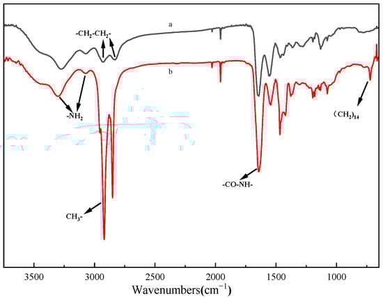 The Fourier transform infrared spectroscopy (FTIR) spectra of HPAMAM and CPAMAM are shown in Figure 1. The –NH2 relative peak area at 3390 cm−1 in the HPAMAM spectrum is significantly lower after modification; this is because palmitoyl chloride consumes the terminal amino groups by a grafting reaction. In the FTIR spectrum of CPAMAM, the –CH3 and –CH2 peaks at 2800–3000 cm−1 are significantly enhanced, the typical (CH2)14 peak is clearly observed at 640 cm−1 [30], and an increased peak from –CO–NH– is observed at 1650 cm−1 [31]. Analysis of the IR spectra indicates that CPAMAM obtained an amide bond by a grafting reaction.