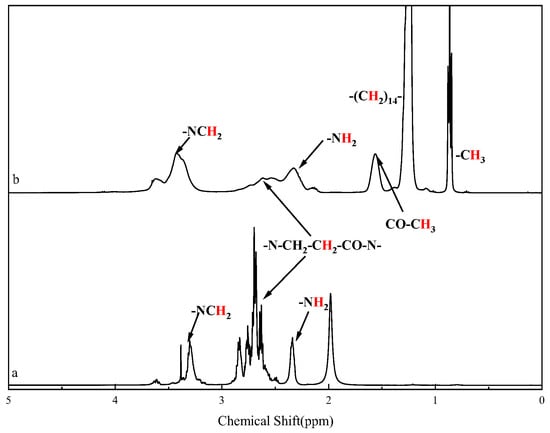 Figure 2 shows the 1H nuclear magnetic resonance (NMR) spectra of HPAMAM and CPAMAM. The signal from the cetyl groups of CPAMAM appears at 0.8–1.7 ppm. The signal from the methylene group linked to the amide bond shifts to 3.2–3.7 ppm, and the –NH2 signal at 2.3 ppm in the HPAMAM spectrum is weaker than that in the CPAMAM spectrum. The signals in the 1H NRM and FTIR spectra match those in the previously reported spectra of polymers [32].