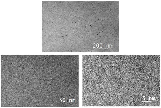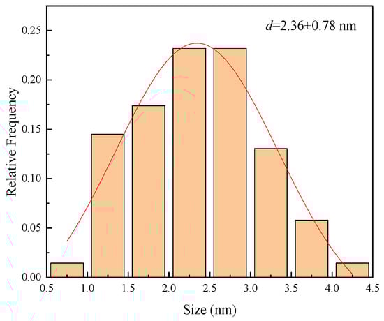 High resolution transmission electron microscopy (HRTEM) images of the nanometal dispersions are shown in Figure 3 and Figure 4, revealing the size distribution of the metal particles calculated from the HRTEM images. Toluene was used as the dispersant for the nanometal. As the HRTEM images show, the metal particles are uniform in size and well dispersed, which indicates that the metal particles have good oil-phase dispersion abilities. The particle size range of the nanoparticles is 1.5–3.0 nm, which indicates that hyperbranched polymers were involved in regulating the growth of metal particles. The small particle size and excellent dispersion also increase the density of metal catalytic sites during in situ combustion.