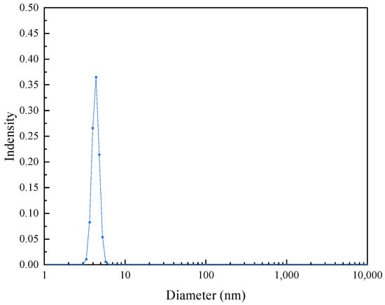 Figure 5 shows the average particle size of the nanometal fluid solution. In a 0.1 wt% solution, the average size of the dispersed particles is approximately 6.0 nm, which is the size occupied by hyperbranched polymer molecules in the solution. Although this size is larger than that of the nanometal particles, it is still one order of magnitude lower than the micron-scale pore throat in a geological formation; therefore, they can pass through the pore throats in geological formations smoothly.