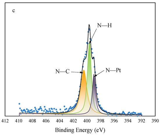 Figure 6a shows the full X-ray photoelectron (XP) spectrum of the Pt@CPAMAM sample; the signals for carbon, nitrogen, oxygen, and platinum elements are present in the spectrum. Figure 6b shows the high-resolution scan of the 4f orbital region of Pt and its peak-fitting results. The distinct double peaks arise from the spin–orbit splitting of Pt 4f7/2 and Pt 4f5/2, with binding energies of 70.9 eV (4f7/2) and 74.1 eV (4f5/2) eV. This indicates that the main forms of the platinum element are Pt(0) and Pt2+. Peak fitting of the integral peak areas shows that the contents of Pt(0) and Pt2+ in the sample are 63% and 37%, respectively. This indicates that the CPAMAM ligands modify and stabilize Pt nanoparticles by binding nitrogen atoms to the surfaces of the Pt atoms in the Pt nanoparticles; this is similar to the peak migration phenomenon of amine-coated Pt nanoparticles [33]. Figure 6c shows the N 1s XP spectrum of Pt@CPAMAM. Three peaks were observed near 400 eV after peak fitting. The N peak at 399.8 eV showed negative and positive shifts. The negative shifts clearly indicate electron transfer between N and Pt, proving that Pt in the sample binds to the polymer via coordinate bonds.