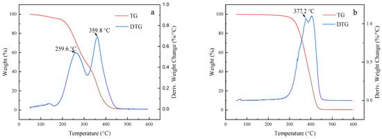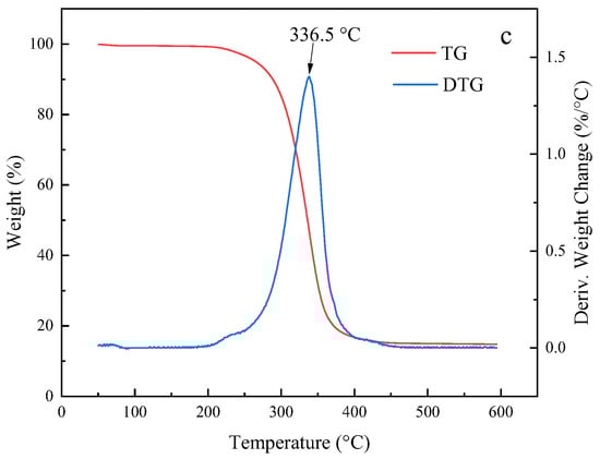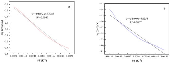 where dW/dt is the mass loss rate, W is the remaining mass of the sample, Ar is the frequency factor, E is the activation energy, R is the universal gas constant, and T is the temperature. The frequency factor and activation energy can be determined by plotting the linear fitting line of log(dW/dt) versus 1/T. The kinetic parameters were obtained from TGA curves at heating rates of 2.5 °C/min, 5 °C/min, 10 °C/min, and 20 °C/min.