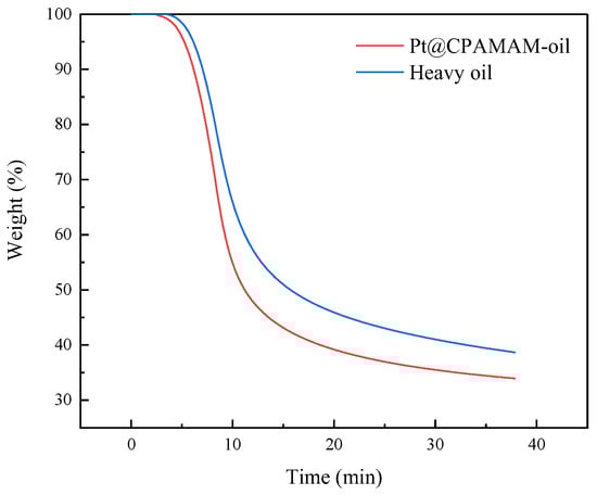 Figure 9 shows a comparison of the rates of cracking of heavy oil with 0.1 wt% Pt@CPAMAM after rapid heating at 100 °C/min to 350 °C and at constant temperature. The heavy oil containing the nanometal decomposed faster during the initial stage of decomposition, and the final residual mass decreased from 38.67% to 33.94%, which improves the conversion rate by approximately 5%. The heavy oil added to the nanometal fluids underwent a deeper cracking reaction at the same temperature, and the catalyst promoted the cracking of heavy oil under high-temperature conditions.