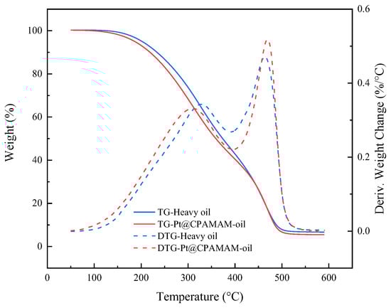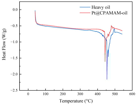 Figure 11 shows the high-pressure differential scanning calorimetry (PDSC) curves for the heavy oil and the Pt@CPAMAM-oil sample. In a nitrogen atmosphere, the decomposition of heavy oil showed two distinct stages, and the heavy oil clearly showed heat absorption at 450 °C. There was also an obvious peak in the TGA curve for the heavy oil in the same temperature range.
