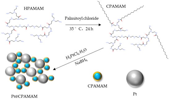 The strategy for synthesizing Pt@CPAMAM nanoparticles is schematically shown in Figure 13. In a typical process, a solution of 0.2 g H2PtCl6·6H2O in water was mixed with a solution of 0.5 g TOAB in toluene. The mixture was stirred for 30 min, separated, and the aqueous phase was removed. After dissolving 0.4 g CPAMAM into the system, NaBH4 (0.15 g in water) was added dropwise to the solution under stirring. The synthesis temperature was 50 °C. After 6 h, the synthesized Pt@CPAMAM nanoparticles were separated by rotary evaporation, washed with ether, centrifuged, and dried under vacuum.