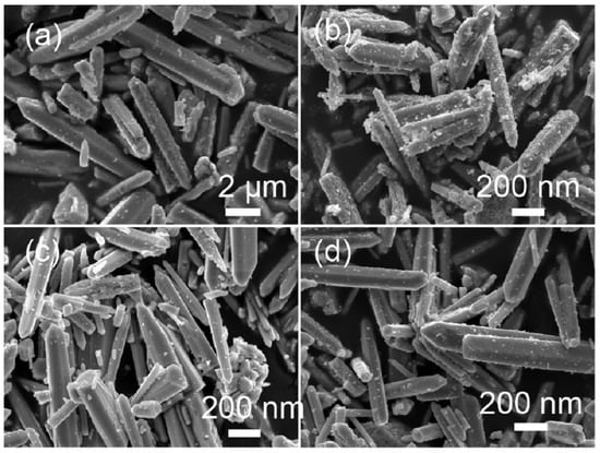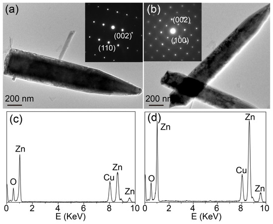 Sample ZW exhibited a hexagonal rod-like shape with a size of about 200 nm (Figure 3a). When annealing ZnO-H with melamine in air, all ZnO-X showed a similar hexagonal rod-like shape (Figure 3b–d), while the sizes of the ZnO rods decreased. TEM, SAED and EDS analyses were employed to investigate the microstructures of ZnO calcined with and without melamine (Figure 4). Both ZW and ZnO-1.2 showed a rod-like shape. The SAED patterns of a single rod revealed the crystalline nature of ZW and ZnO-1.2 (insets in Figure 4a,b). The SAED pattern of ZnO-1.2 could be indexed to the (002) and (100) reflection of ZnO, while that for ZW was indexed to the (002) and (110) reflection. EDS spectra also confirmed that these rods were mainly composed of Zn and O elements (the Cu element came from the TEM copper grid of the sample holder, Figure 4c,d). This result demonstrated that calcining ZnO with melamine changed the growth habit of ZnO, which was in accordance with XRD analyses.