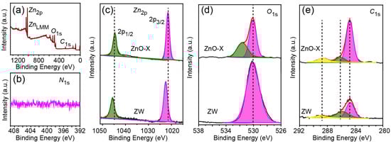 The high-resolution XPS spectrum of Zn 2p for ZnO-X displayed two peaks at 1021.5 eV and 1044.6 eV, corresponding to the Zn 2p3/2 and Zn 2p1/2 of ZnO [16]. The difference in binding energy between Zn 2p1/2 and Zn 2p3/2 states was 23.1 eV, which matched well with the standard value (23.0 eV) (Figure 5c). For ZW, two peaks appeared at around 1022.5 eV (Zn 2p3/2) and 1045.6 eV (Zn 2p1/2) with a similar energy distance (23.1 eV). It is worth noting that the shift of the peak for ZnO-X toward lower binding energy confirmed an increase in the electron density of the Zn2+ species, which resulted from the formation of oxygen vacancies in ZnO-X [17].
