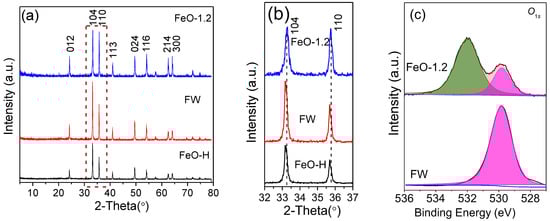 (a) XRD patterns and (b) the enlarged XRD patterns (in the region of 2θ = 32–37°) of FeO-H, FW and FeO-1.2. (c) The high-resolution XPS spectra of O 1s of FeO-H and FW.