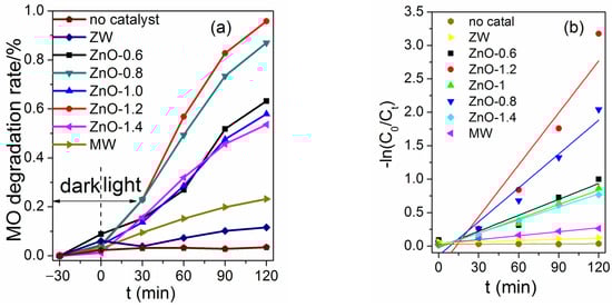 The UV-Vis spectra of methyl orange (MO) after different irradiation times over ZnO-X are shown in Figure S3. The concentration of MO decreased with the extension of irradiation time. The photocatalytic activity of samples was evaluated (C0 and Ct are the equilibrium concentrations of MO before and after irradiation, respectively). ZnO-X showed an improved photocatalytic activity. When using ZnO-0.6, ZnO-1.0 or ZnO-1.4 as the photocatalyst, the degradation rate was less than 60% (Figure 10a). When using ZnO-0.8 as the photocatalyst, the degradation rate reached 87%. It is noteworthy that ZnO-1.2 exhibited a much higher activity (95.8%) than the other ZnO-X, and the MO solution was decolorized completely after 120 min of irradiation, which was similar to Ni-doped ZnO (94.47% for dye degradation) [23], while slightly lower than composites, for example, ZnTi-LDHs/g-C3N4 (~100% for dye degradation) [24] and BiOBr/Bi2Sn2O7 (99.6% for dye degradation) [25]. A blank experiment in the absence of photocatalysts but under irradiation showed that a small quantity of MO was reduced. When using ZW or MW as the photocatalyst, only a small amount of MO was degraded (13% for ZW and 25% for MW after 150 min of irradiation).