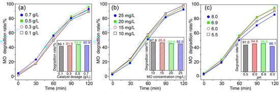 The effect of catalyst dosage, initial concentration of MO solution and the pH value on the photocatalytic degradation of MO were investigated (Figure 11). With the increase in catalyst dosage from 0.1 to 0.5 g/L, the degradation rate of MO increased from 89.1% to 95.8% (Figure 11a). It is known that, the more catalyst is added, more active sites are available for MO degradation, which can improve the photocatalytic activity. However, increasing the catalyst dosage further (0.7 g/L) caused a decrease in the degradation rate of MO (92.9%). Excessive catalyst would scatter the light that penetrates into the reaction system, leading to a decrease in the photocatalytic activity. Thus, an optimum catalyst dosage for the degradation of MO was 0.5 g/L. Figure 11b shows that the degradation rate of MO gradually decreased from 97.8% to 92.0% as the initial concentration of MO increased from 10 mg/L to 25 mg/L. At lower concentrations, all MO in solution could interact with the active sites on the surface of catalyst, which led to an increase in the degradation rate compared with those at higher initial MO concentrations.