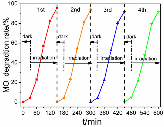 The influence of initial pH of the reaction solution on the degradation of MO was investigated (Figure 11c). When the pH value increased from 5.5 to 6.9, the degradation rate of MO increased from 91% to 95.8% and then slightly decreased to 86.1% at pH 8.0. MO changes to a negatively charged azo structure when the pH value is greater than 4.5 [27]. In our experimental conditions, the pH values were between 5.5–8.0 and MO molecules were negatively charged. Photocatalytic activity is related to the formation of reactive species such as hydroxyl radical (•OH), superoxide radical anion (•O2−) and holes during the photocatalytic process. In basic conditions, it is easy for photogenerated holes to react with OH− to form •OH. However, in our experiments, •OH was not the dominant active substance during the degradation process. Therefore, a basic condition has less effect on improving photocatalytic activity. With the increasing pH value, more OH− in the solution would increase the competition with negatively charged MO, which could hinder the contact of MO with the catalyst and reduce the photocatalytic activity. Herein, the degradation rate of MO decreased to 86.1% while pH value increased to 8.0.