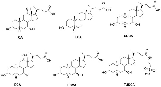 Bile acids have long been recognized as detergents capable of solubilizing cholesterol and fatty acids to promote digestion and transport. Recent studies have revealed more expansive and profound paracrine and endocrine functions that have driven investigations on their therapeutic applications [1]. Drug development for metabolic disorders has harnessed the potential of bile acids as regulators of glucose and lipid metabolism, insulin sensitivity, and energy expenditure [2,3]. Downstream bile acid pathways have also exhibited a vast array of anti-inflammatory [4,5], cancer suppression [6,7], neuroprotection [8], viral inhibition [9], and intestinal and cardiovascular properties [10,11,12,13]. Therefore, the regulation of bile acid pathways is a promising therapeutic strategy for a host of metabolic disorders, cancers, and diseases. Due to their tremendous potential, the modulation of bile acids has arisen as an attractive approach for various therapies.