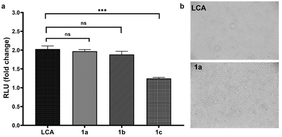 TGR5 agonistic activity of LCA and compounds 1a–1c at 5 μM. (a) Data are presented as mean ± SE from n = 3 replicates. Bioactivity was compared between groups using unpaired t-tests. ns: no significance (p > 0.05); *** p < 0.001. (b) The representative images of HEK293T cells under treatment with 5 µM LCA and 5 µM compound 1a. RLU, relative luciferase units.