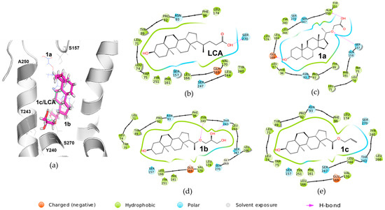 Explanation of bioactivities of LCA and its three analogs 1a–1c using the binding pocket and docking poses within TGR5. (a) Docking poses of LCA and its analogs 1a–1c overlapped together. (b) Two-dimensional interaction diagram of LCA with TGR5. LCA formed a hydrogen bond with S270 via hydrophilic acidic side (purple arrow). (c) Two-dimensional interaction diagram of 1a with TGR5. Compound 1a formed more hydrogen bonds with S157 and A250 residues in TGR5 protein compared to LCA (purple arrow). (d) Two-dimensional interaction diagram of 1b. Compound 1b formed more hydrogen bonds with Y240 and T243 in TGR5 protein compared to LCA (purple arrow). (e) Two-dimensional interaction diagram of 1c. More hydrophobic compound 1c could not form hydrogen bond with the hydrophilic residues anymore.