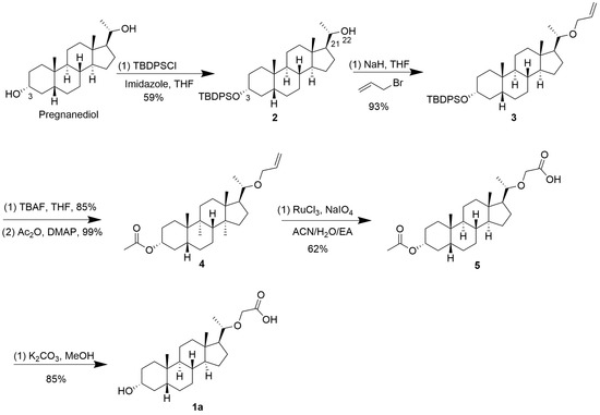 The synthesis route for compound 1a initially involved a 3-step synthetic route with compound 2 as the starting material: (i) reaction with ethyl bromoacetate (22-position); (ii) deprotection of TBDPS (3-position); and (iii) hydrolysis of the ester group (22-position). Unfortunately, there was no reaction between compound 2 and ethyl bromoacetate; we tested the reaction under multiple conditions, including different reaction temperatures, bases (potassium carbonate, sodium hydride or t-butyl lithium), and solvents (acetonitrile, DMF, DMSO, and THF). The failed reaction was determined to be potentially due to the large steric hindrance between the hydroxyl group in compound 2 and ethyl bromoacetate. This prompted us to modify the synthesis route (Scheme 1) using the allyl group, since this group could be easily transformed to a carboxyl acid group under oxidizing conditions. We experimented to develop a feasible synthesis method and compound 1a was synthesized by inserting allyl group from compound 2, deprotecting/protecting the 3-postion hydroxyl group to obtain compound 4, oxidizing the vinyl group of compound 4 to a carboxyl group by means of RuCl3 as a catalyst and NaIO4 as an oxidant, and removing the acetate group of compound 5 in a solution of potassium carbonate in methanol.