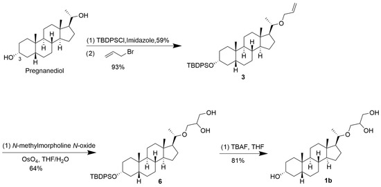 Design and synthesis of compounds 1a–1c began with commercially available pregnanediol. Because of the differences in the steric hindrance of the two hydroxy groups on pregnanediol, the 3-hydroxy group on pregnanediol could be selectively protected by tert-Butyldiphenylchlorosilane (TBDPSCl) to obtain compound 2 with a 59% yield.
