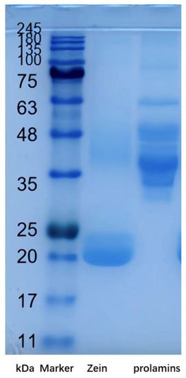 - Zhu, L.; Li, X.; Song, X.; Li, Q.; Zheng, F.; Li, H.; Sun, J.; Huang, M.; Sun, B. Characterization of prolamin recycled from the byproduct of the Baijiu brewing industry (Jiuzao) by SDS-PAGE, multispectral analysis, and morphological analysis. Food Biosci. 2022, 49, 101854. [Google Scholar] [CrossRef]