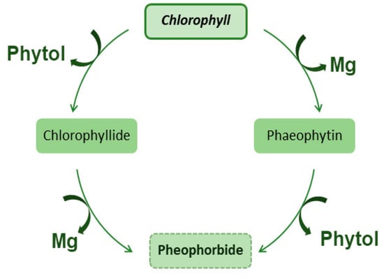 When it comes to green plants and vegetables, storage and processing conditions greatly impact the green color of these foods conferred by chlorophyll, whose degradation can be delayed or accelerated by these conditions [,,,,]. This, in turn, has a great influence on the behavior of the final consumer, that is, not consuming them if the products do not have an attractive green color, thus further contributing to food waste.